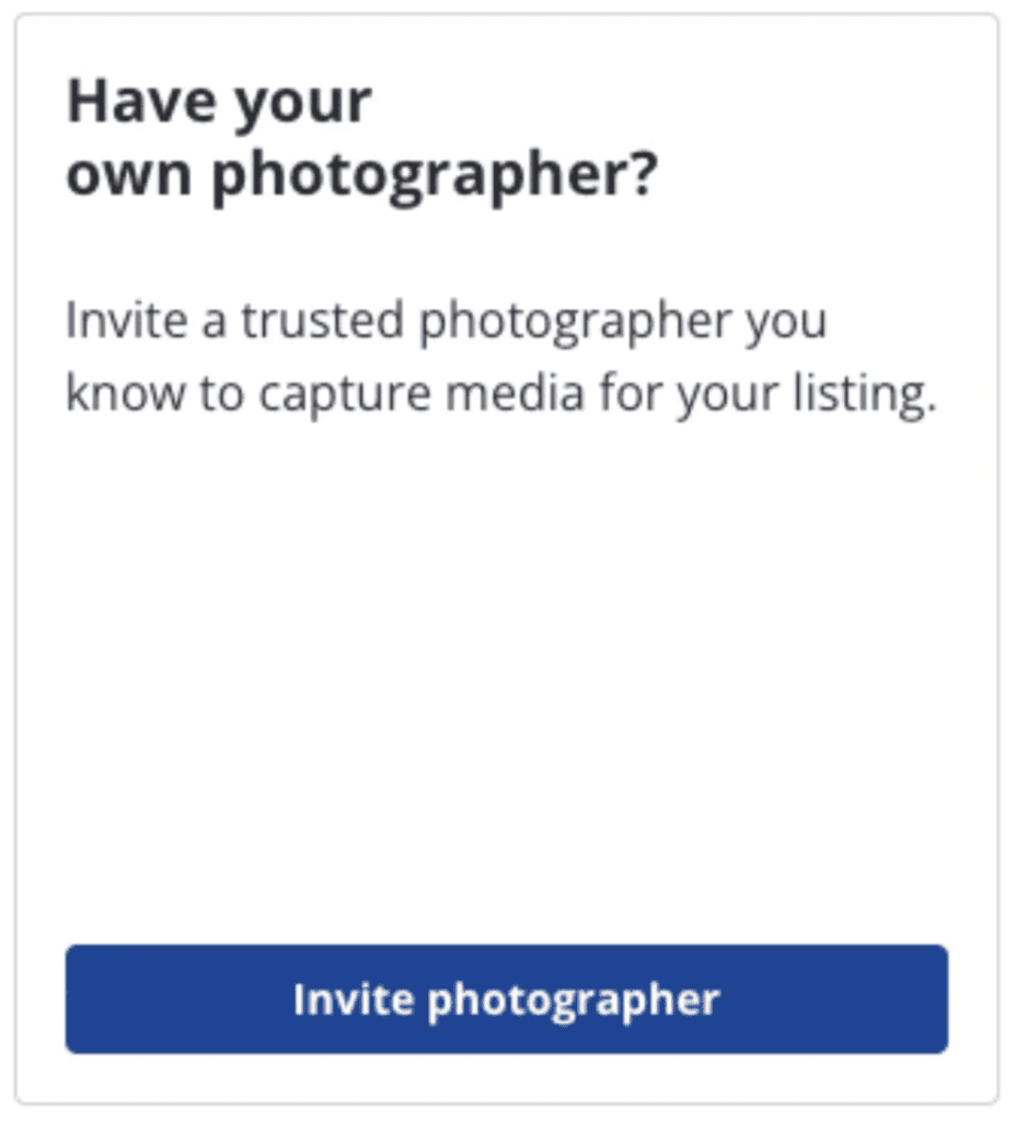 - Request the Upload: Go to your Zillow® Showcase dashboard for that specific listing and click the button to “Get Media”. Then select “Photography companies you know,” and then the “Invite photographer” button.