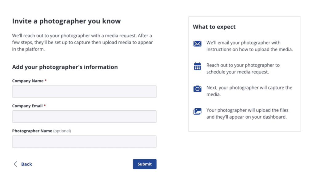 - Select “Photography companies you know,” and then select the “Invite photographer” button.